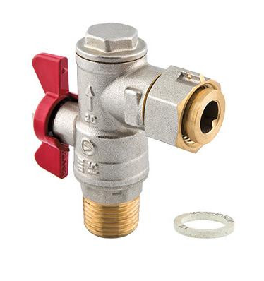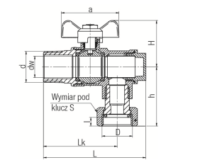 Kurek kulowy kątowy z dławikiem, motylkiem aluminiowym (MAL) i obrotową nakretką i filtrem wersja nakrętno-wkrętna.