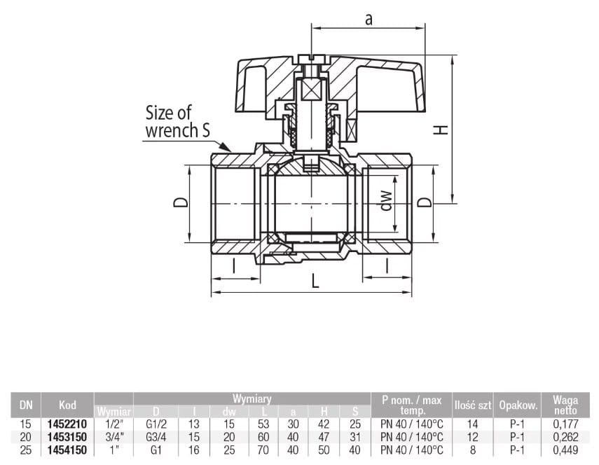 - Korpus, nakrętka, kula, czop, dławik: mosiądz;